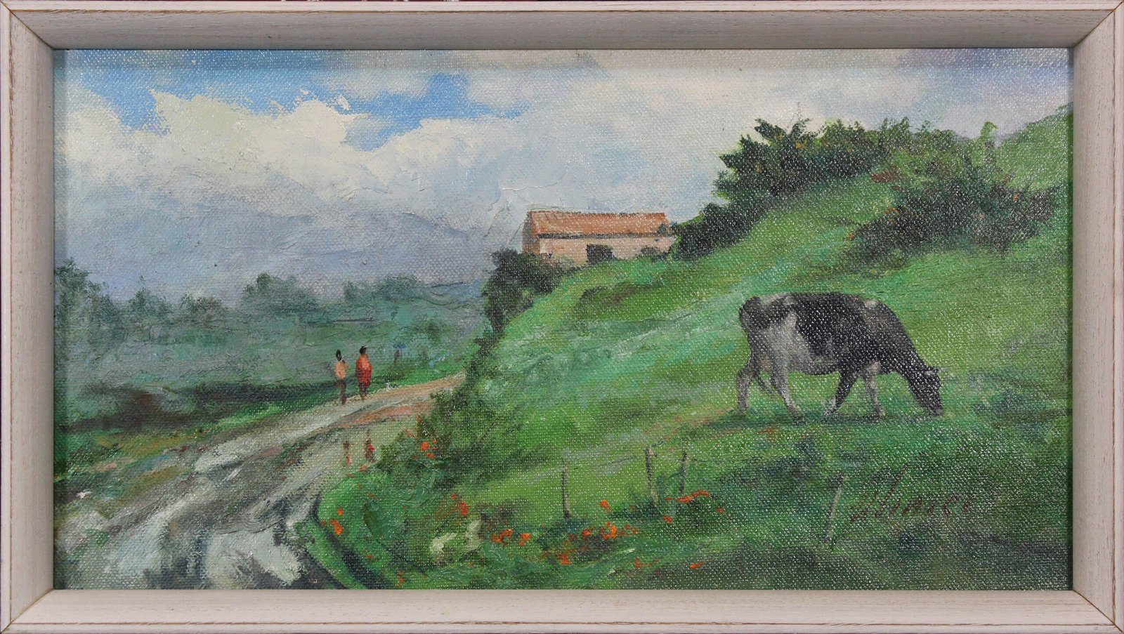 Vitalie Ulinici presenta una escena campestre íntima, construida con una composición muy efectiva: el camino en diagonal crea profundidad y movimiento, mientras la ladera verde y la casa en altura estabilizan el conjunto. La atmósfera, dominada por nubes suaves y azules grisáceos, refuerza la sensación de humedad y tranquilidad, y hace que los verdes del prado respiren con más intensidad. La presencia de la vaca —tratada con tonos oscuros y pincelada contenida— funciona como punto de anclaje visual y añade un acento narrativo. Una obra ideal para quien busca un paisaje contemporáneo, natural y atemporal.