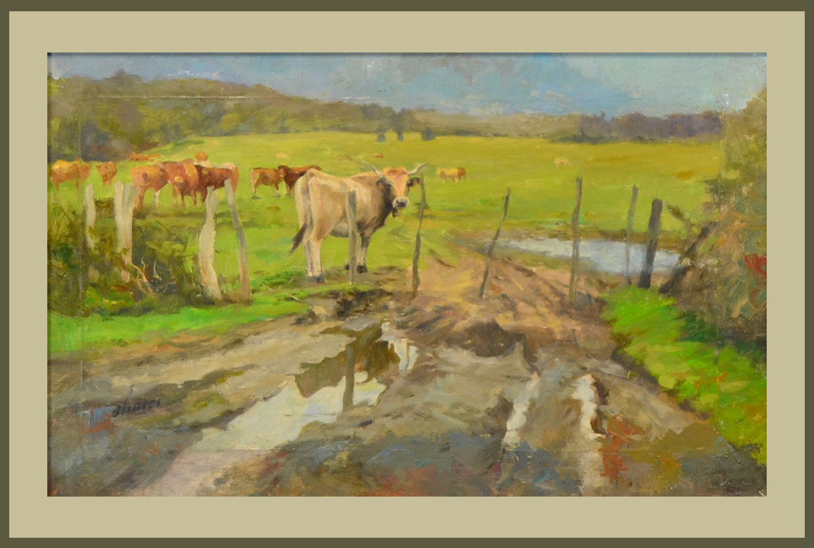 Ulinici captura el encanto de lo cotidiano en el campo: el camino de barro, con sus brillos y charcos, construye la composición y refuerza la sensación de distancia. Las vacas, repartidas en el plano medio, equilibran la escena y aportan narrativa. La paleta limpia, dominada por verdes y ocres, mantiene la obra ligera y muy integrable en interiores cálidos o naturales.