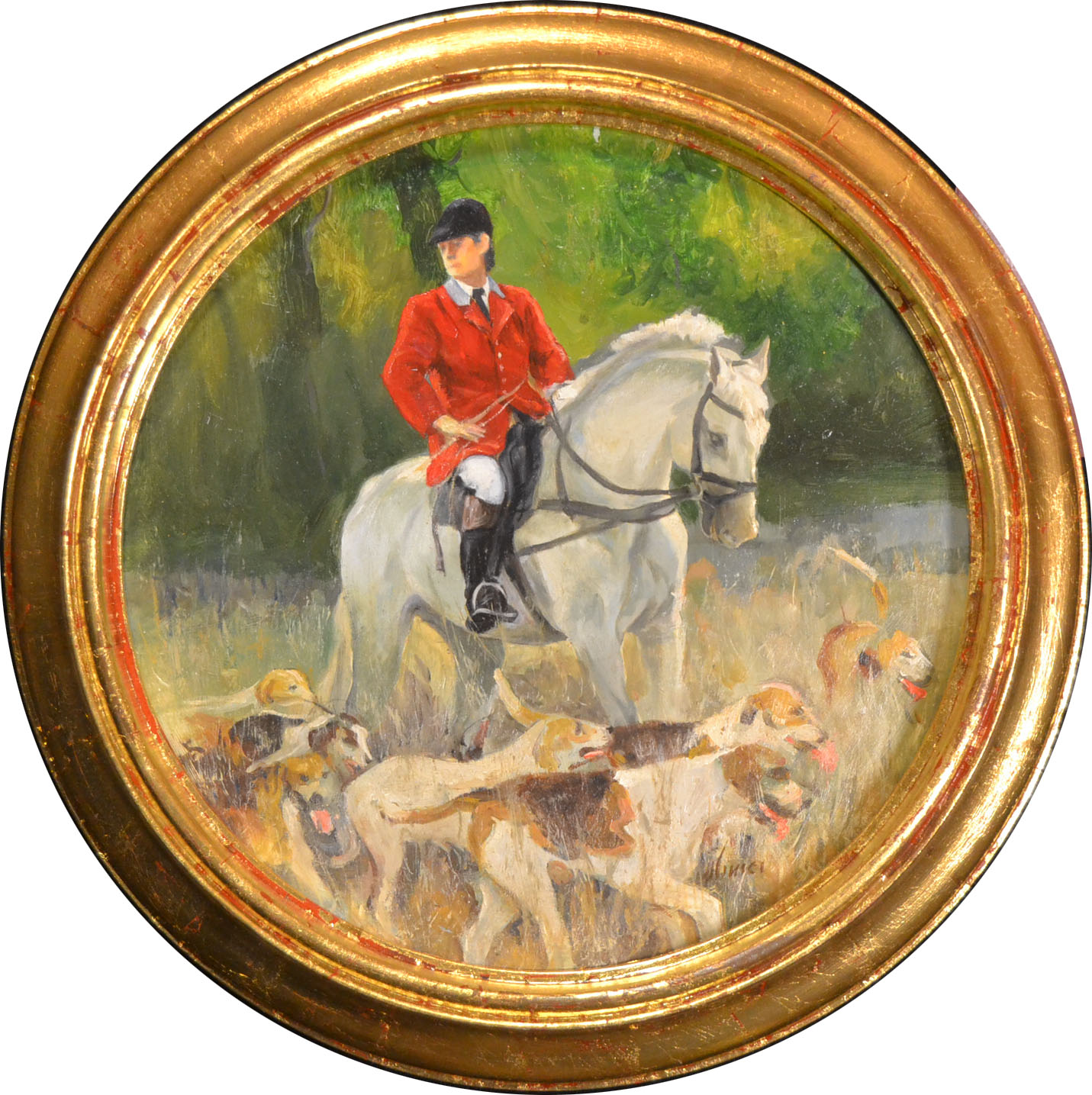 Esta obra destaca por su formato circular, que potencia la sensación de movimiento y encierra la escena como si fuese una ventana. La figura del jinete en rojo actúa como foco principal y contrasta con el paisaje, mientras el caballo blanco y la jauría construyen ritmo y profundidad. Una pieza con carácter, ideal para espacios con gusto por lo ecuestre y lo atemporal.